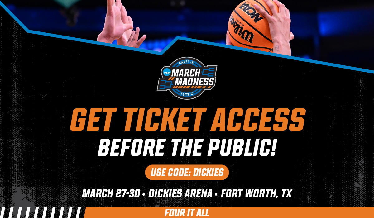 Be a part of the March Madness women’s basketball tournament! This is the fourth year of the updated format where you can now watch 8 teams battle it out in the Sweet Sixteen and Elite Eight rounds and witness two teams advance to the 2026 Women’s Final Four! The action takes place at Dickies Arena March 27-30, 2026. Tickets for the Fort Worth Regional will be going on sale in the fall and you can be part of the exclusive presale by signing up today!